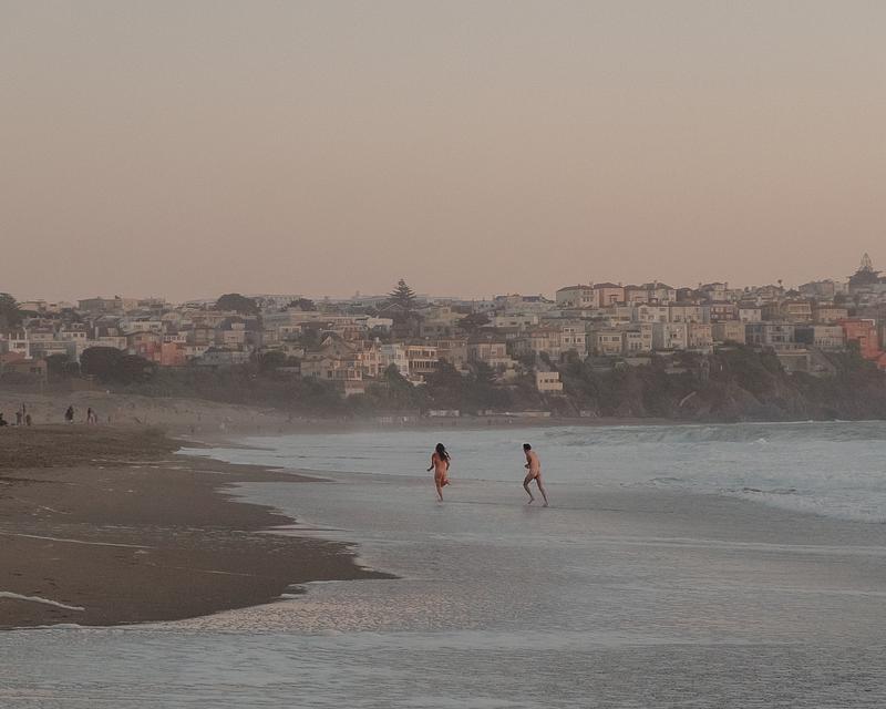 A couple running along the waves at Baker Beach in San Francisco, CA